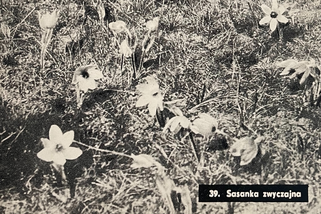 “Nasłonecznione zbocza wydmowe cechuje roślinność charakteru stepowego. Na wiosnę na zboczach tych zakwitają występujące niekiedy masowo sasanki, których na terenie puszczy rośnie kilka gatunków.” Patrząc na zdjęcie sasanki zwyczajnej z przewodnika, wykonane przez Romana Kobendzę, aż trudno uwieżyć, że wtedy można było podziwiać aż tak masowo rosnące kwiaty.